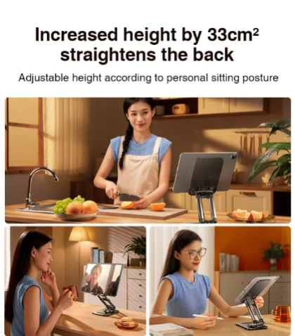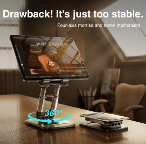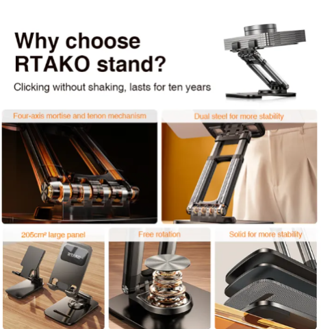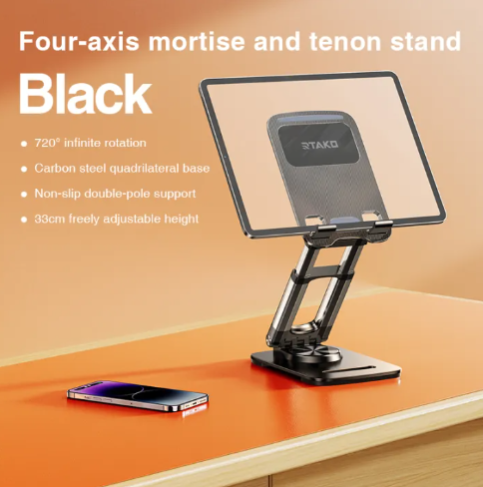 RTAKO ZJ-P01 Rotating Phone and Tablet Stand Black 360° Rotation Flexible Adjustment Portable Storage Stable and Anti-slip Product Color: Black and White Product Materials: Iron + Aluminum Alloy + ABS+ Silicone Innovative & Practical Ruitak redefines basic styles If you want to choose, choose Ruitak Four-axis Mortise and Tenon Bracket Because, it is flat as the tabletop! No Shaking, Four-axis, mortise and tenon device "It wont fall down" 205cm large panel More stable, solid carbon steel base Convenient, can be rotated 360° Four-Axis Mortise and Tenon Bracket is inherently more stable Imitating the mortise and tenon structure, it is now more stable and durable for drawing, watching TV shows and working at home. Four-axis, mortise and tenon device can easily bear 80kg and completely solve the problem of easy shaking.