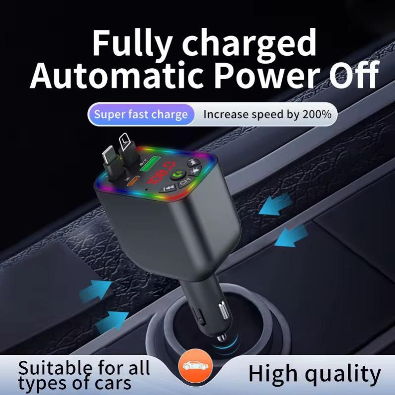 1. Bluetooth hands-free calling 2. Echo cancellation and noise processing during calls 3. Stereo Bluetooth and FM transmission technology 4. Support USB/Bluetooth function 5. Support MP3 format music 6. Automatic power-off memory function 7. Cigarette lighter power supply: DC12V-24 voltage power supply 8. Bluetooth version 5.3FM transmission frequency: 87.5-108Mhz 9. Voltage detection 10. Retractable length of retractable cable: about 800mm 11. Built-in 2 retractable charging cables Specification Model Name: Car-Y5 Fast Car Charger Product material: ABS+PC Bluetooth version: 5.3 Product power: Max 120W Stretch line length: 800mm Input voltage: 12-24V Phone output: 5V/3.1A USB output: 5V/3.1A Type-C output: Support super fast charge (Max 100W)