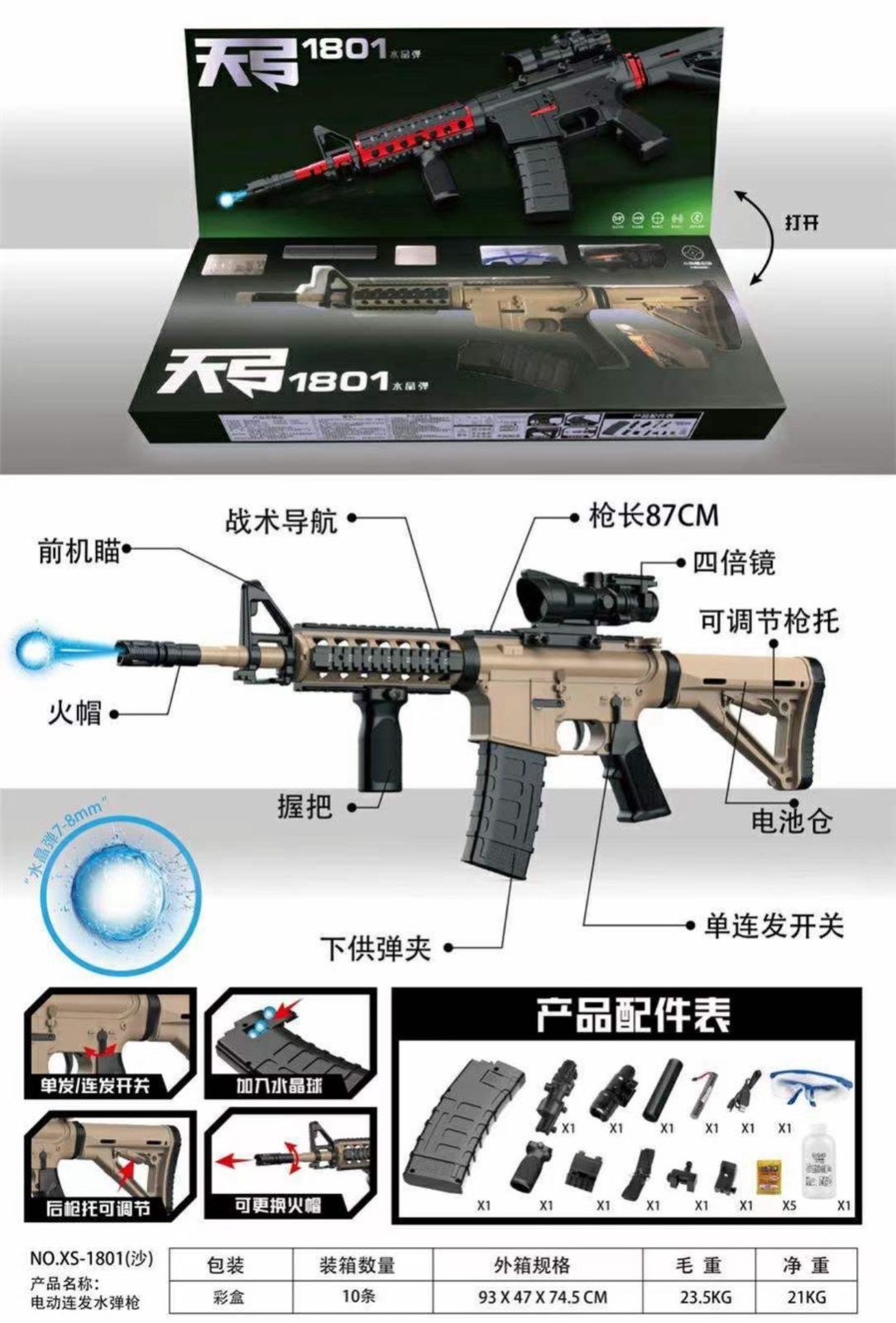 Product Name: Ejection Model Gun Product Model:XS1801 Material composition: plastic and electronic components Applicable age: 14 years and above Implementation standard: GB/T 26701-2011 | Manufacturer/Manufacturer: Xingshen Toy Factory, Chenghai District, Shantou City Address: Building 19 (Rolling Workshop), Wire Factory, Industrial Zone, Donggang Road, Chengcheng, Chenghai District, Shantou City warn! This product is only for use by adolescents and adults over 14 years old, and is not for use by children; 2. The product contains small parts and small balls, which may cause suffocation if swallowed by children. Children under 3 years old are prohibited from contacting or using it. 3. Laser radiation, do not look directly into the beam! 4. When playing, do not aim at the eyes or face, do not shoot people or animals at close range, do not shoot at fragile targets, always use projectiles provided or recommended by the manufacturer, and do not modify the projectile device. Maintenance: This product contains electronic components. Do not immerse it in water or use it in a humid environment. Wipe surface stains with a dry cloth. 5. Do not change the color of the model gun at will or make it more realistic. It should be used within the scope permitted by law. This packaging contains important information and must be kept! 6. Do not use in a dark environment 7. Do not use near ears