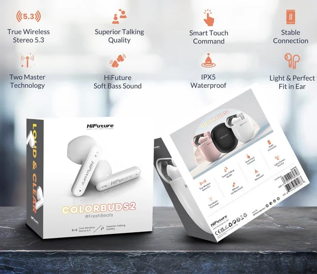 The HiFuture Color Buds2 True Wireless Earbuds redefine the audio experience with their remarkable features and cutting-edge technology. Boasting a sleek design and advanced functionality, these wireless earbuds offer a seamless blend of style and performance. One notable feature of the HiFuture Color Buds2 is their ability to deliver crystal-clear sound and soft bass, providing users with an immersive listening experience. With an impedance of 32 ohms and a driver size of 10 mm, these earbuds ensure crisp and balanced audio quality, making every beat and note vivid and distinct. Equipped with a built-in microphone, these earbuds enable hands-free calls, adding a layer of convenience to your daily communication. The 300 mAh battery capacity ensures a prolonged usage time of up to 4 hours on a single charge, promising uninterrupted music playback or call time. What sets the HiFuture Color Buds2 apart is the incorporation of HiFuture Smooth Bass technology, enhancing low frequencies and delivering a rich, deep bass that elevates your listening pleasure. Specifications of HiFuture Colour Buds: HiFuture Soft Bass Technology Smart Touch Technology IPX5 Water Resistant Stable Connection Smart Touch Command Driver: 15.4 mm Quantum Chipset Wireless range: 10 m Battery Life: 20 hours Charging time: 2 hours Earphone Type True Wireless Earbuds (TWS)Bluetooth Version Bluetooth V5.3 Bluetooth Chipset JL6973D4 Bluetooth Profile HSP, HFP, A2DP, AVRCP Wireless Range 10 meters (Free Space) Audio Decode SBC, AAC Speaker diameter 10mm, N42 Neodym Speaker impedance 32Ω Speaker Rate Power 3mW Battery: Earbuds /Case 300mAh Cell,230mAh Li-Polymer Charging Case Input Voltage & Current DC5V / 1A (Charging Case) Charging Port Type C Microphones MEMS Earbuds Dimension 16.5*31*7mm