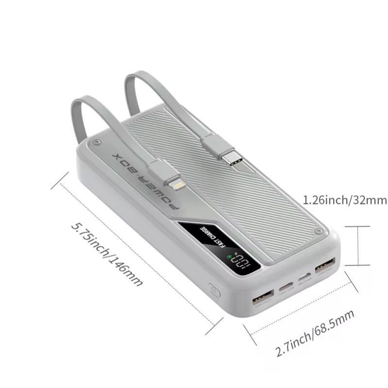 Product Name Custom Digital Display Multi-compatible Fast Charging USB Type-C Output 20000mAh Power Bank Portable Charger For Mobile Phone Power Bank Model No. DX241 Capacity 20000mAh Color Gray Input USB/Type-C/Micro Output USB/Type-C/iP Size 146*68.5*32mm
