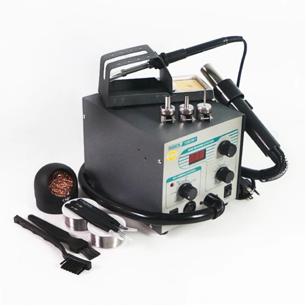 Quick 706W+ 580W LED Digital Display 2 In 1 Hot Air SMD Rework Station Soldering Station Iron Heat Gun Kit for Phone Welding Repair Hot Air Station Power Consumption: 580W Soldering Iron Power Consumption: 50W 24V/AC Voltage: 220V / 110V for choose Soldering Iron Output Temperature: 100°c - 480°c Display: LED Digital Display Air Out Way: Straight wind Features: LED accurate digital display, single control. effectively avoid the damage of components due to temperature error Small Size. Save working space. Hot Air Rework Station and Soldering Station 2 in 1. Ceramic skeleton heating core increases stability and is not easy to burn short circuits. Straight wind, high speed, low noise, and strong wind The handle is equipped with a sensor device, which is placed on the handle frame. The system will automatically cool down and enter the standby state Attention: Be careful when operating at high temperatures. Do not use it near flammable and explosive gas and objects. The air outlet is hot and can burn the body. When the hot air gun is working, please do not leave your position. Do not touch the hot air gun by children. After using be sure to cool down the machine and put it in a safe place. When it’s turned off, the heating tube will gush out cool air temporarily. During cooling time please do not take out the power plug. After cooling, take out the power plug.